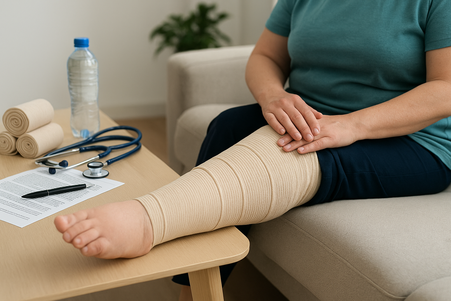 Short-stretch compression bandaging is often used in intensive treatment phases to actively reduce volume. Once swelling is controlled, custom or off-the-shelf compression garments (sleeves, stockings) are worn daily to maintain results. Garments come in different compression levels—your therapist will recommend the right one.